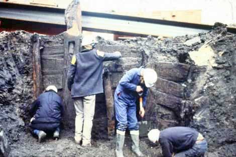 One such multi-storey carpark stood on what had been Three Cranes Wharf in the Vintry, and became the thoroughly waterlogged, timber-rich Thames Exchange excavations (TEX88). This was a develop-funded project, supported by Kumagai Gumi UK. The on-site supervisors were Chrissie Harrison, Jo Stephenson and Morag Coloquon, truly a triumvirate to be reckoned with.