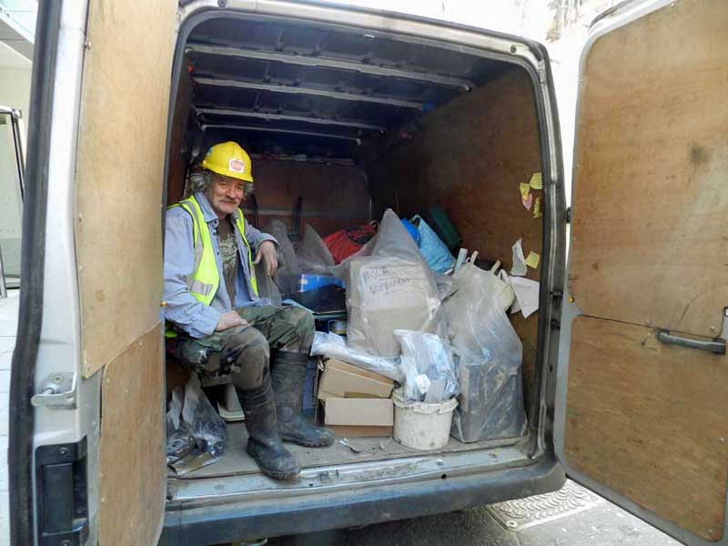 Two of the unsung heroes of the DUA/MOLAS in the years between 1988-1991 were Patrick Connolly and the late Alan (Al) Gammon – former Thames Mudlarks who were employed (on a full salary would you believe!) as full time metal detectorists working alongside the archaeologists. During this time they worked on a number of high-profile archaeological excavations across the City, and there was consequently an enormous spike in the number of metal finds recovered during that period, as compared to the levels of recovery before or after. I will endeavour to find a photo of Al, although there is no such problem with Pat – because after slipping off the radar and ‘resting’ for a period of 20+ years – he is now back in the fold (bus fare money only this time) and has been volunteering on a whole host of MOLA sites these past couple of years. The most stunning of these sites in terms of metal finds was the Bucklersbury House (Temple of Mithras) site – where Pat was responsible for the recovery of the bulk of over 10,000 accessioned finds. Pat can be seen in the Regis House group photo taking a quick nap behind Bruce, with the more recent photos showing him with one of his finds at Bucklersbury House, the other alas reveals the horrific truth that following his reported ‘disappearance’ in 1991 – he had in fact been kidnapped by MOLAS and has been kept in the back of an assortment of tool vans ever since.