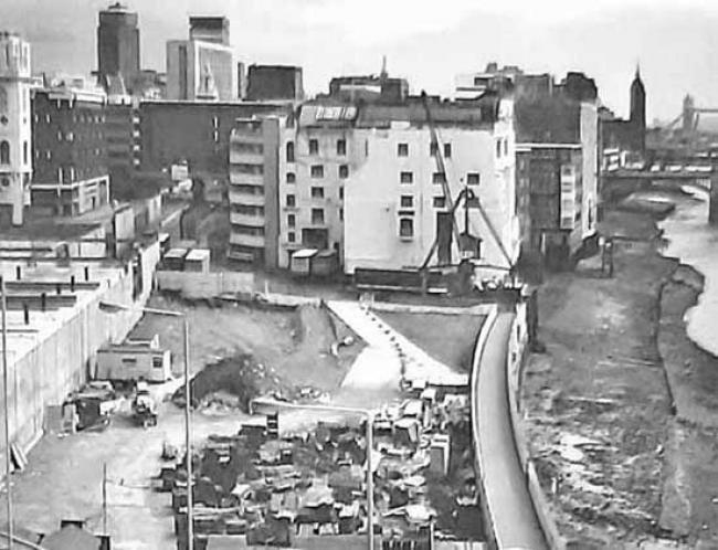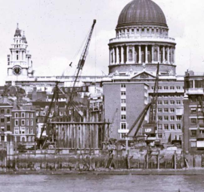 And south of the excavation was the site’s crowning glory, the sparkling Thames itself. Here she ran between two unmistakable landmarks. On the opposite work-a-day Southwark shore stood the Bankside power station, completed in 1960 It was the largest oil-fired generating station in England, its tall chimney pumping out ominous grey clouds throughout the 70s. In marked social and architectural contrast on the City side, the pompously-splendid St Pauls dominated the landscape.