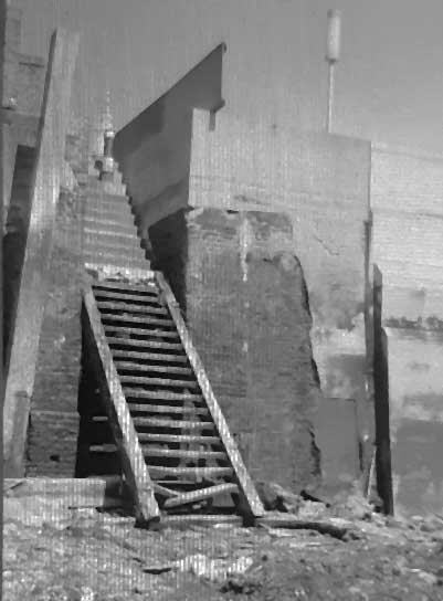 Trig Stairs, slightly worse for wear in the 1970’sAll that protected our site from the river was the newly-constructed concrete walkway, the initial location for the rustic wooden shed serving as a site hut-cum-finds store for the archaeological team. But that riverwall also incorporated a dilapidated wooden stair running down to the foreshore, the last representative of the long lost Trig Lane, a street that could trace its ancestry back to a Plantagenet past. The diggers could therefore walk, picnic or mudlark on the foreshore in their lunch hours if, of course, the tide was out. All in all, an Eden for urban archaeologists.