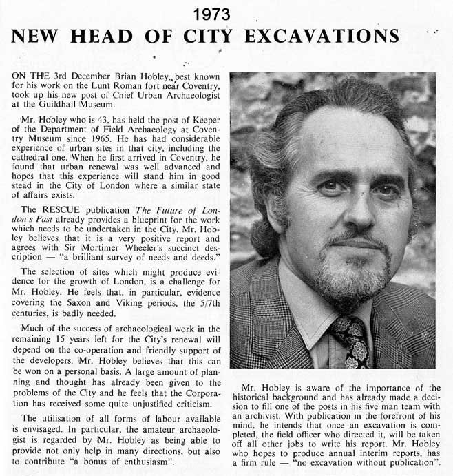 I still have a vivid memory of my DUA job interview with Brian and John Schofield on a snowy winter's day in 1979 at the Basinghall St offices; I got a short-term contract on the basis that I was good at shovelling and didn't mind the cold (having grown up on a dairy farm in Ontario I was highly qualified in both instances). Brian was certainly a character and played an important part in convincing developers to provide funding and time for excavations, though he had his faults too (but who doesn't)