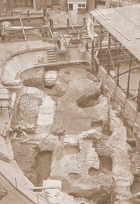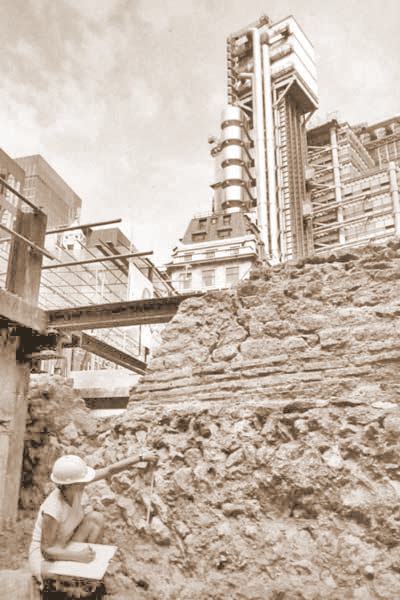 monumental Basilica and Forum (town hall & market), the largest such complex in the country. Its massive scale demanded your attention: it proved that Londinium was the most important town in the province, and don't you forget it. But forget it you must: the whole lot was deliberately demolished in the Roman period long before the entire settlement was abandoned. This was just one of the startling results of the archaeological project at Leadenhall Court in 1984-6, funded by Legal & General Assurance Company, English Heritage and the City of London Archaeological Trust. The excavations incorporated three open areas and fifteen trenches dug in the basements of more- or-less standing buildings. And there were other surprises too, such as evidence of the large medieval Leadenhall Market building, supposedly demolished in the late 18th-century.