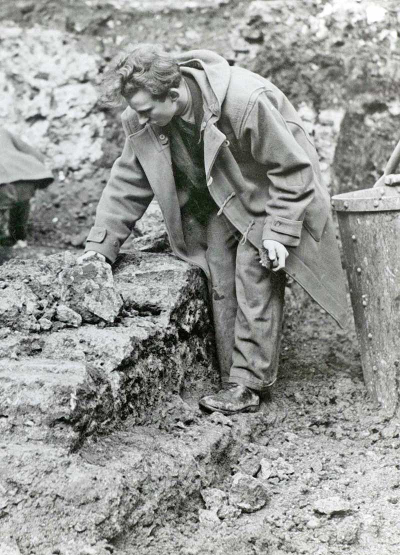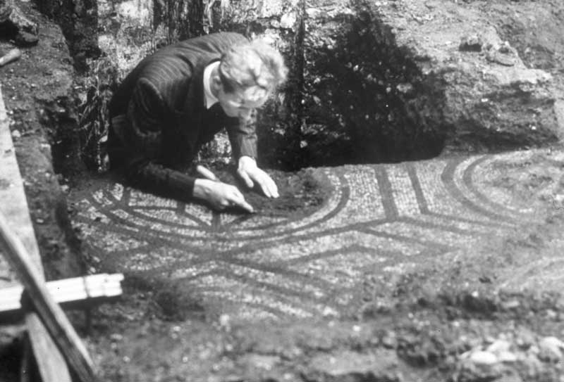 Noel, unusually sans duffle-coat, looking dapper in his de-mob suit, exposing the Roman mosaic at 11 Ironmonger Lane in 1949
