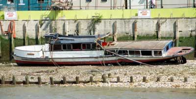 This sad scene is the image I still most strongly associate with TEX88: ironically that poor ship had been the very one used for a boat trip to celebrate the 1985 book launch for The Port of Roman London.............