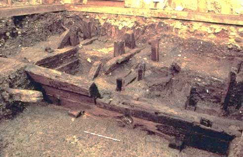 But the first structure which utilised a baseplate, a quite different technology, was a timber-framed jetty feature, well to the south on the site. Amazingly, it was built in the early 13th century as an extension to a late 12th century earthfast waterfront