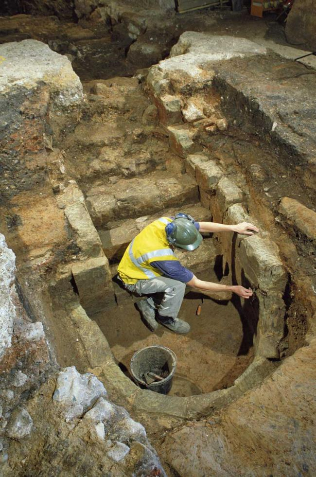 The Milk Street mikveh showing the full extent of the original structure, with Ian Blair (looking north) Photo by permission: MOLA ©MOLA Photographer Andy Chopping